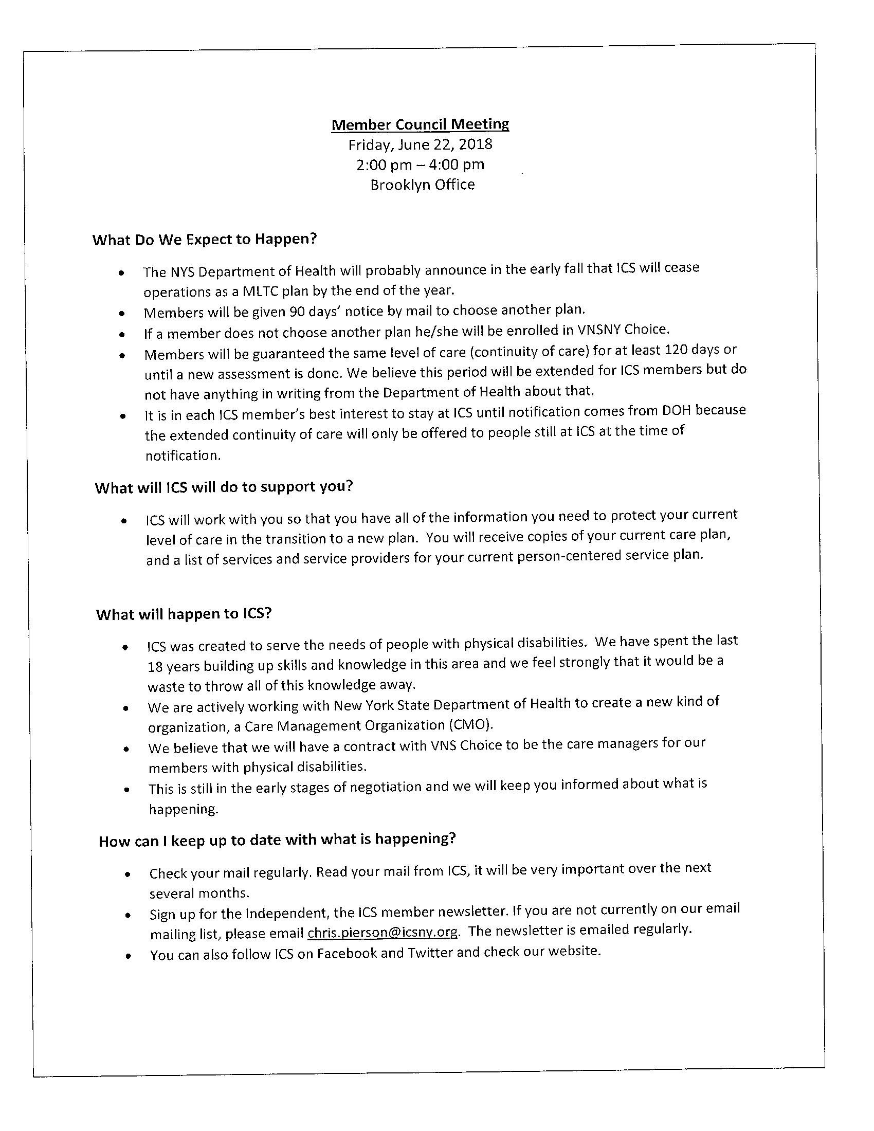 Memo dated June 22, 2018 to Member Council of Independence Care Systems stating that closure of ICS MLTC plan would likely be announced in early fall, 2018, and that members would receive 90 days notice to choose another plan, or they would be assigned to VNS Choice. The memo states, "Members will be guaranteed the same level of care (continuity of care) for at least 120 days or until a new assessment is done." The memo states, "It is in each ICS member's best interest to stay at ICS until notification comes from DOH because the extended continuity of care will only be offered to people at ICS at the time of notification."